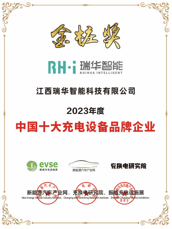 展会第一天,也是2023年度充电设施金桩奖的颁奖盛典,在繁华的上海之夜,江西瑞华智能科技有限公司以卓越的品牌实力,荣获“2023年度中国十大充电设备品牌企业”。